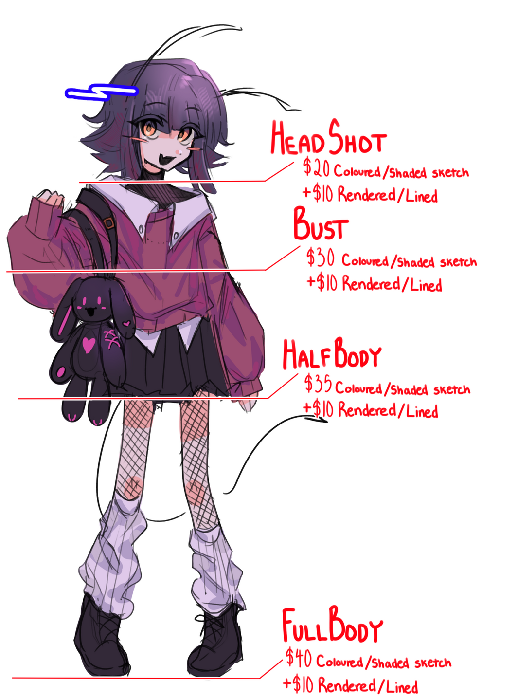 ・ As the artist, I maintain all rights to my work. This includes posting to my socials, and adding it as a part of my portfolio.・My work is for personal use only unless given explicit permission.・No refunds after the sketch phase.・ I maintain the right to cancel the commission if the commissioner is acting inappropriately.・Payment must be sent through Paypal in full before or at sketch approval・All major changes have to occur during the sketch phase. Any major changes after the sketch phase will incur a separate fee.・ Neither Commissioner nor anyone is allowed to alter, trace, copy the finished product.・Do not claim my art as your own.